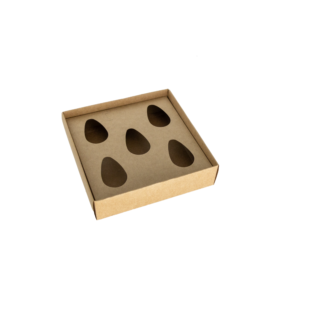 A Caixa para 5 Ovinhos oferece sofisticação e praticidade para apresentar seus ovinhos de chocolate de maneira profissional e elegante.